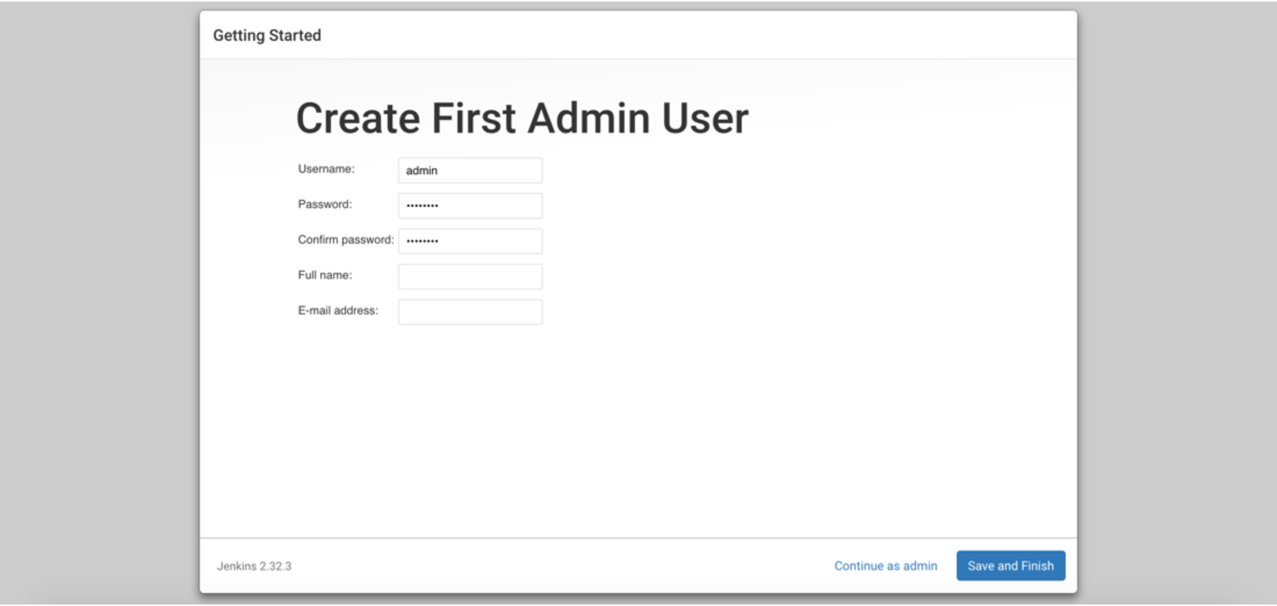 We must create our first administrative user on the third screen. Although you are technically an administrator user with the generated password you are using, you might want to make a new one.
