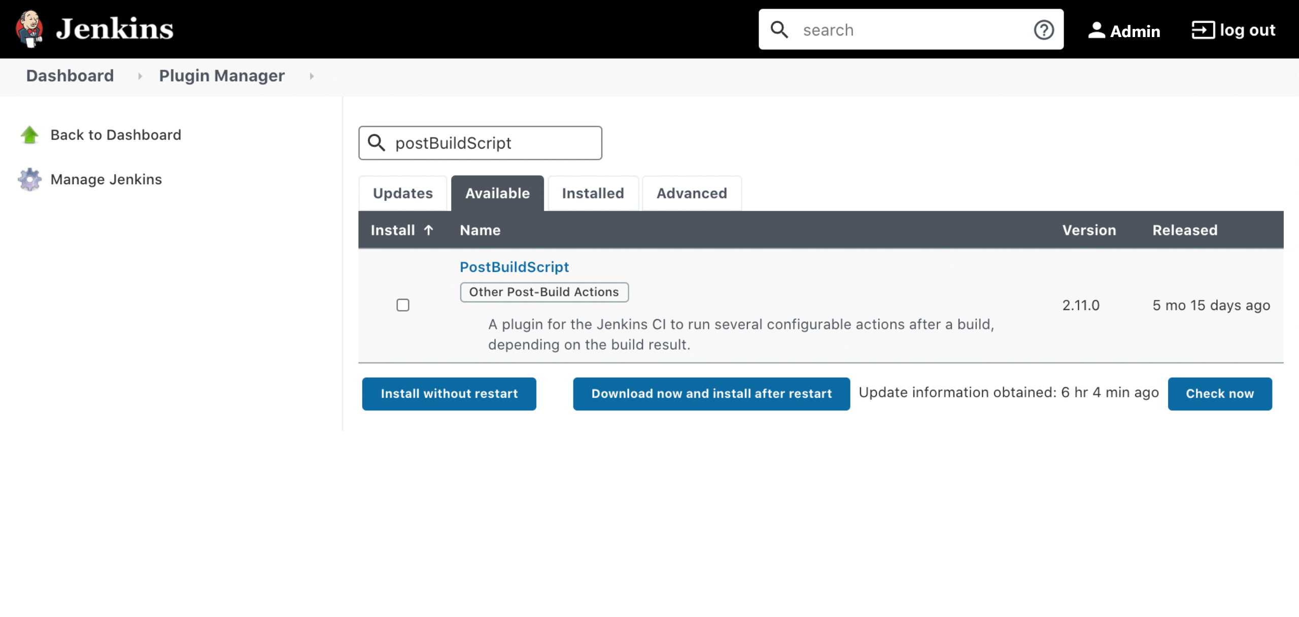 Managing the available plugins is what we are interested in. After selecting Manage Plugins, we want to look for and instal the PostBuildScript plugin.