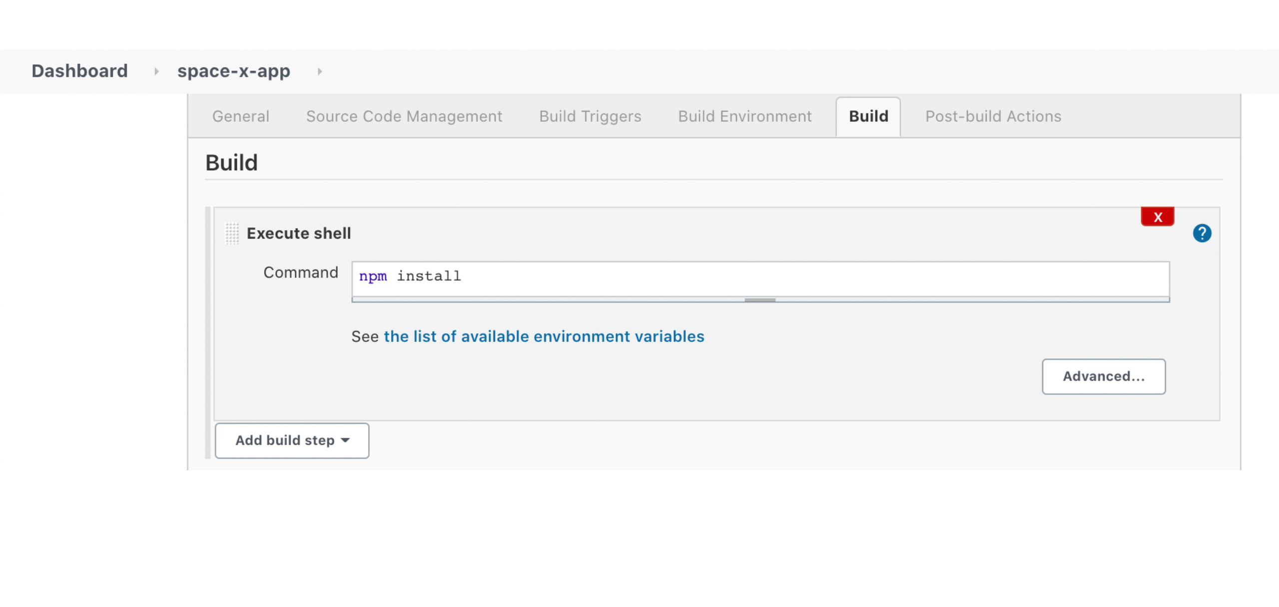 We must configure the build step after configuring the source control section. Building for Node.js merely entails installing dependencies, however unit testing or other tests might easily be included at this phase. The build step includes more in the Jenkins Java project. The only thing present in this Node.js example is what follows: