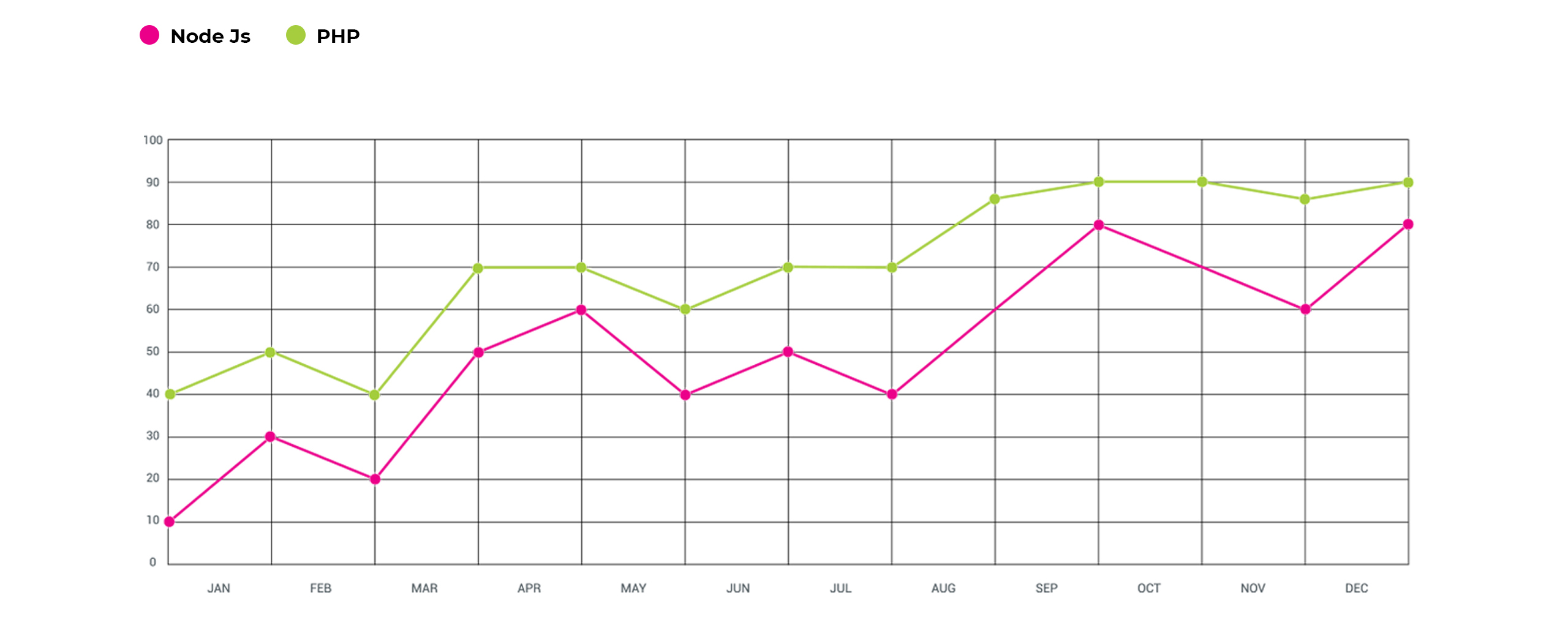With JavaScript, however, a number of trends are present, including the object prototype paradigm, which draws developers, and the Syntax’s apparent lightweightness. Despite this, the JavaScript Syntax has received much criticism for math issues, even though they are few and can be resolved with the aid of math libraries. However, the biggest advantage of Node.js in terms of syntax is that you do not need to learn a totally new language; if you are somewhat comfortable with JavaScript, then despite the fact that there are more lines of code, it would be easier to work with, giving Node.js an advantage over PHP.