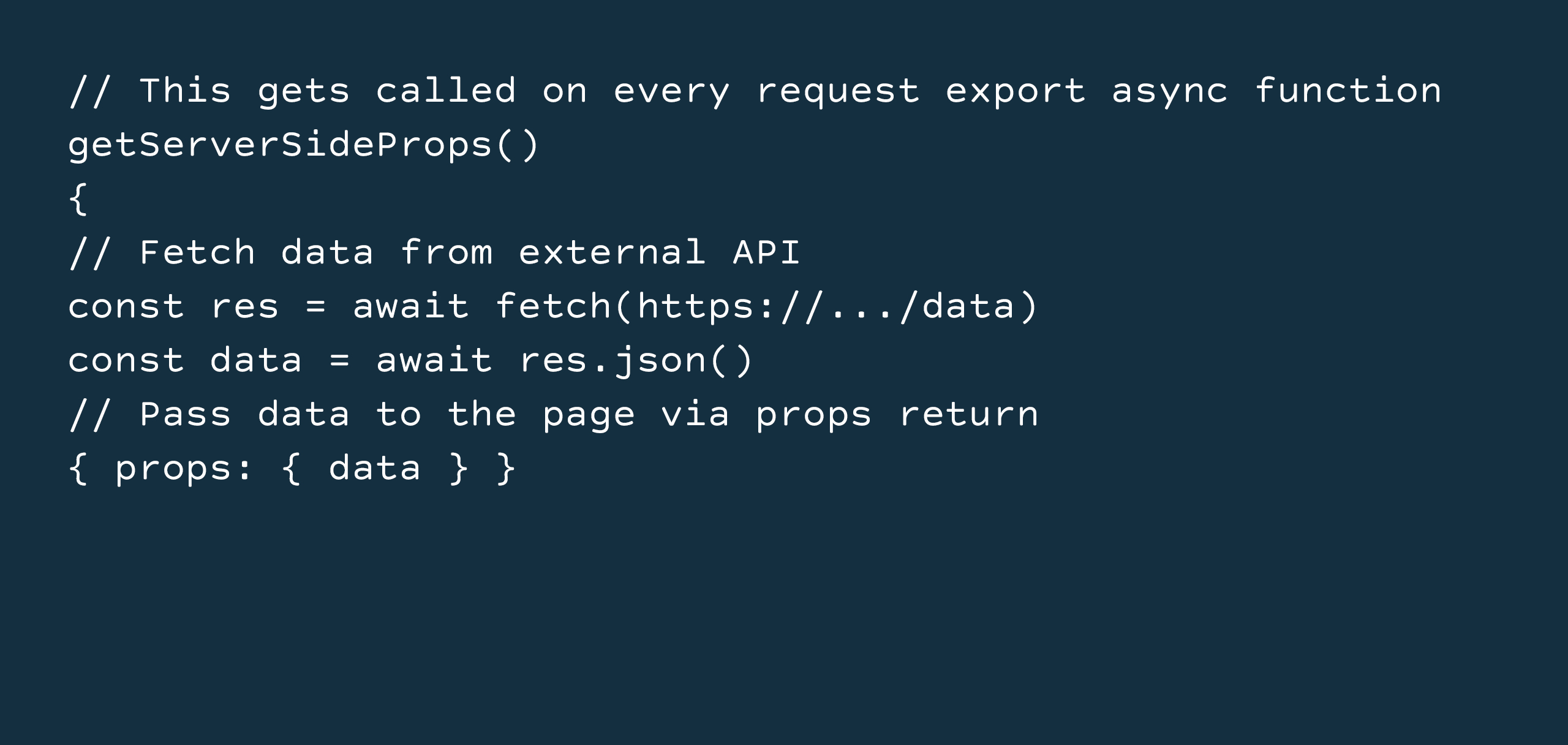 Previous versions of Next.js needed a brand-new API in order to resolve the request data outside of the component’s lifecycle and use it as component props. A Next.js 12 technique for collecting data from a third-party service is shown in the example below: